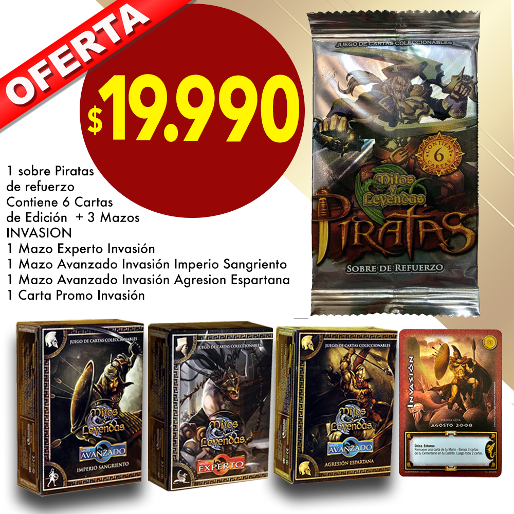 1 sobre Piratas de refuerzo Contiene 6 Cartas de Edición + 3 Mazos INVASION 1 Mazo Experto Invasión 1 Mazo Avanzado Invasión Imperio Sangriento 1 Mazo Avanzado Invasión Agresion Espartana 1 Carta Promo Invasión